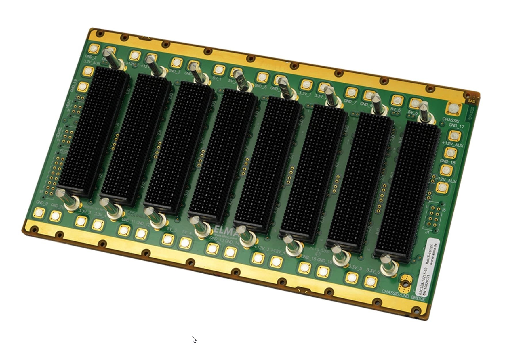 3U OpenVPX Backplane 8-slot, VITA 65, Backplane profile BKP3-CEN08-15.2.16-n, payload slot profile SLT3-PAY-2F2U-14.2.3, switch slot profile SLT3-SWH-6F6U-14.4.1 and SLT3-SWH-2F24U-14.4.3, power connections with M3/M4 power bolts