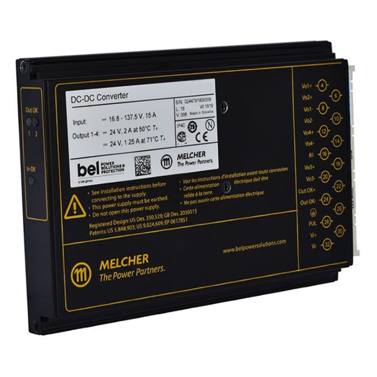 DC/DC converter with 192 W from Bel Power Solutions | input ranges 16.8 - 137.5 VDC | two outputs at 15 V | operates in temperatures from -40 to +71 °C | provides 10 ms hold up time | 20 mm heatsink included