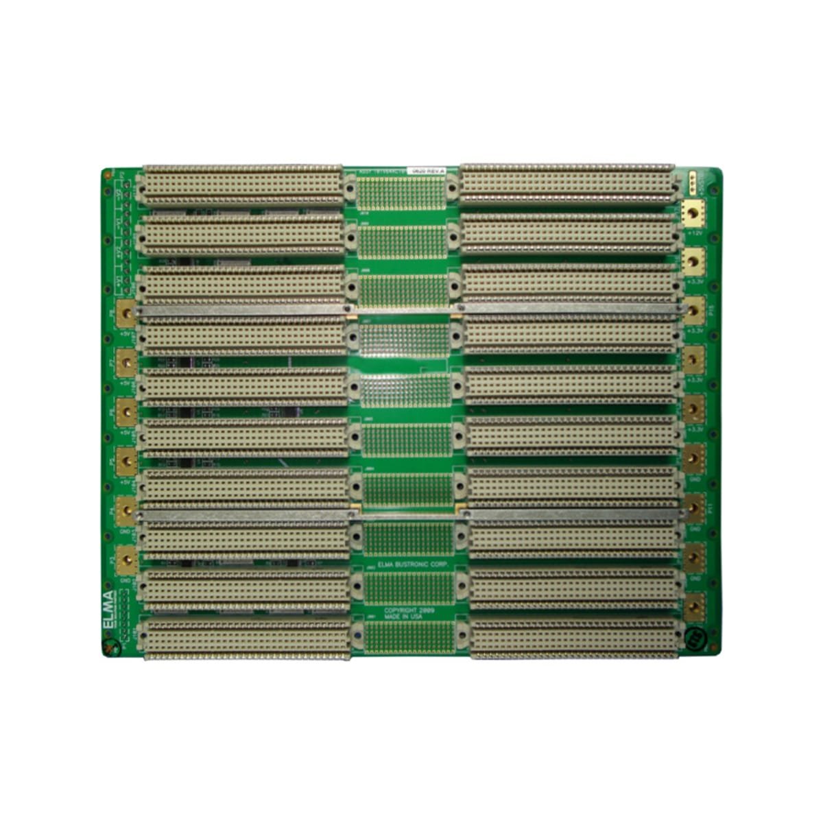 6U VME64x Backplane 10-slot without P0, compliant with ANSI/VITA 1.1-1997, VME extension standard. Includes termination passive inboard, daisy chain automatic active, and power bugs on top and bottom of slots.