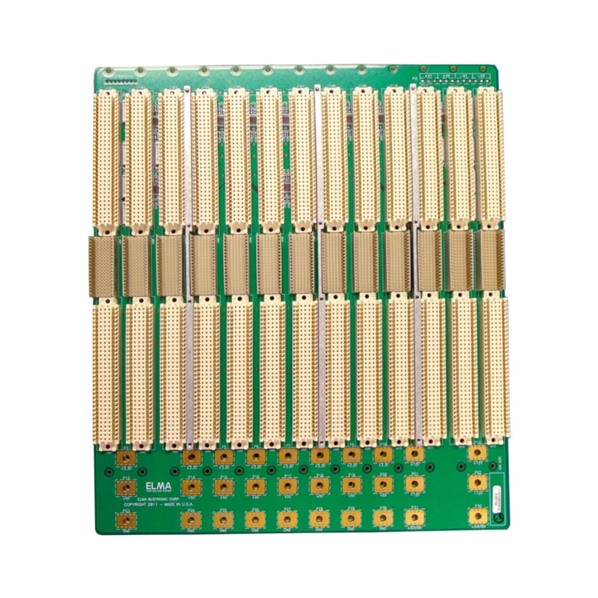 7U VME64x Backplane 4-slot w/o P0, compliant with ANSI/VITA 1.1-1997, VME extension, and VITA 1.7 Increased Current. The extra 1U provides room for extra power bugs or busbars. Includes termination passive inboard and daisy chain automatic active.