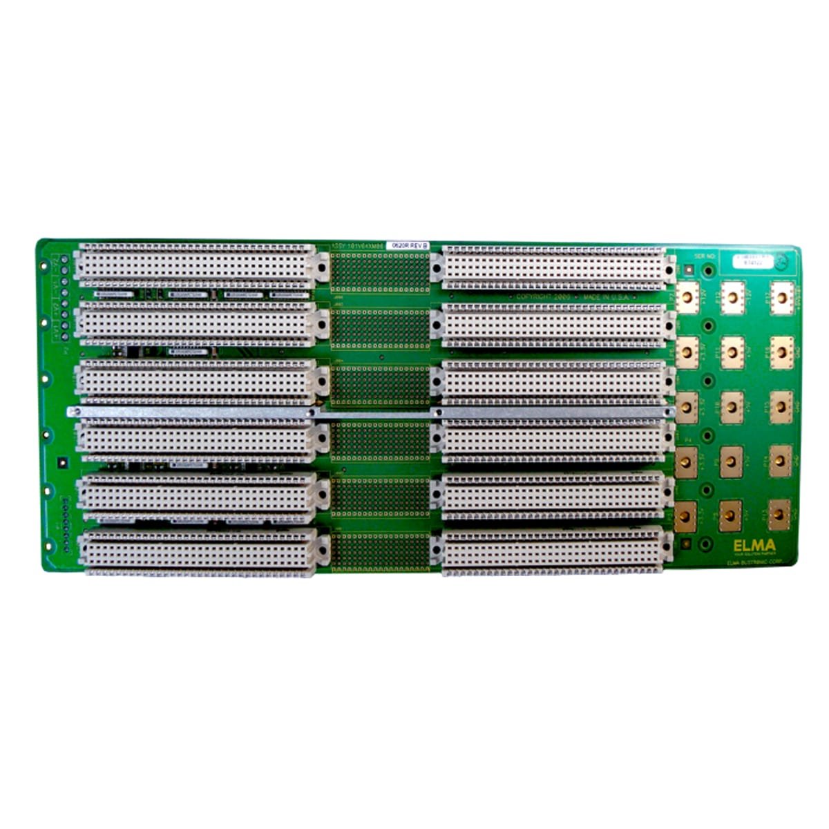 7U VME64x Backplane 6-slot w/o P0, compliant with ANSI/VITA 1.1-1997, VME extension, and VITA 1.7 Increased Current. The extra 1U provides room for extra power bugs or busbars. Includes termination passive inboard and daisy chain automatic active.
